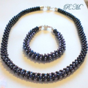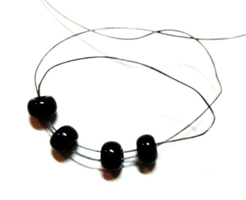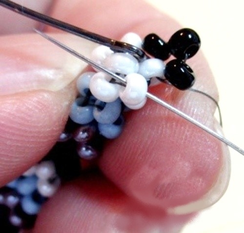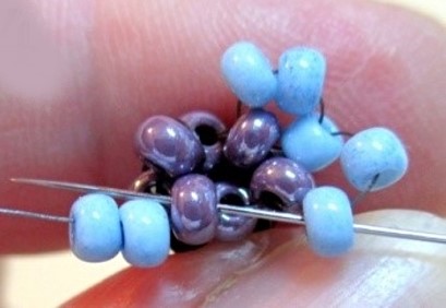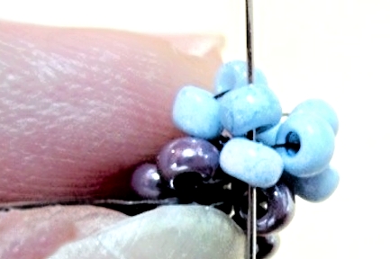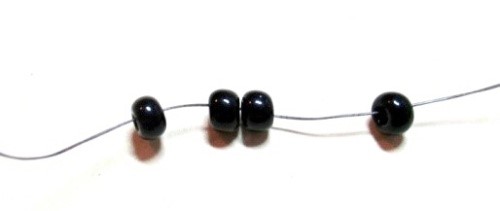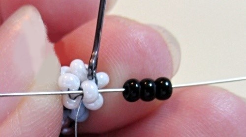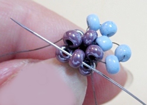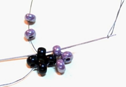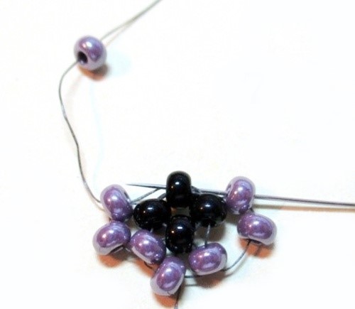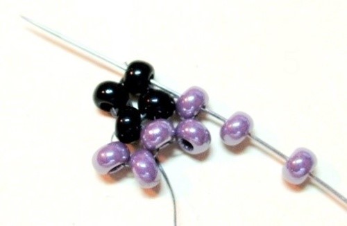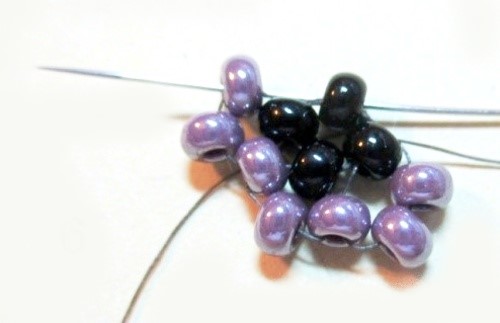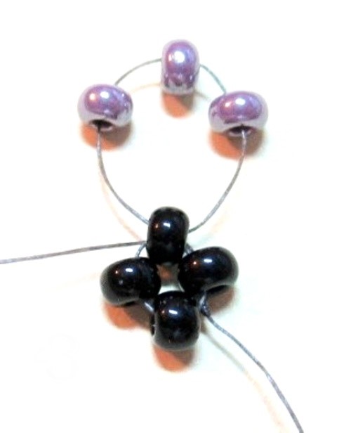 Navlékněte 4x R8. Prošijte je znovu od prvního navlečeného korálku a Nit vychází z R8 černé a naberte 3x R8 fialovou.