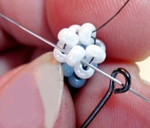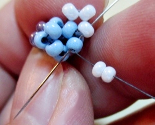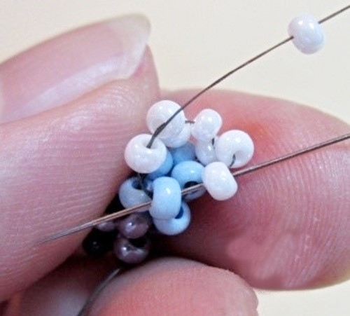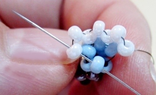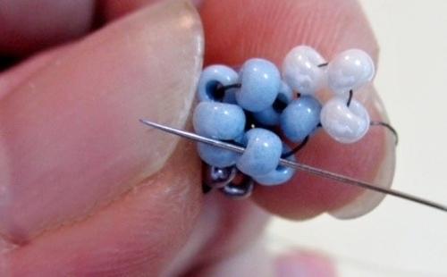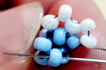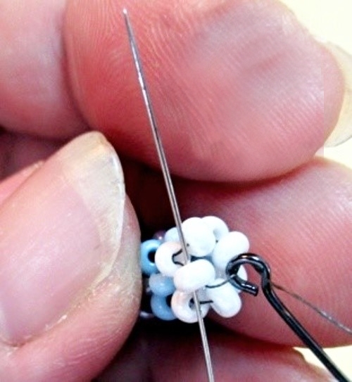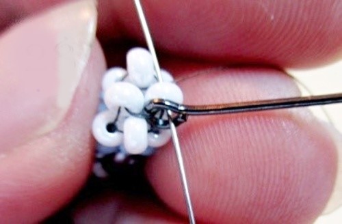 Všechny korálky 4 vrchní R8 prošijte a stáhněte k sobě. Zapošijte konec nitě do výrobku.