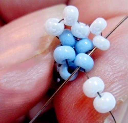 Nit vychází z modrého R8 . Naberte 2xR8 bílý a prošijte Prošijte R8 modrý podle obrázku. Naberte 2xR8 bílý. Prošijte bílý R8 a modrý R8.