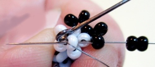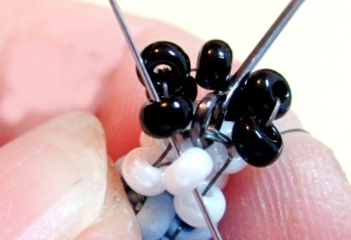 Prošijte znovu očko ktelovací jehly a bílý R8. Naberte 3xR8 černý a prošijte bílý R8. Prošijte vedlejší bílý R8.