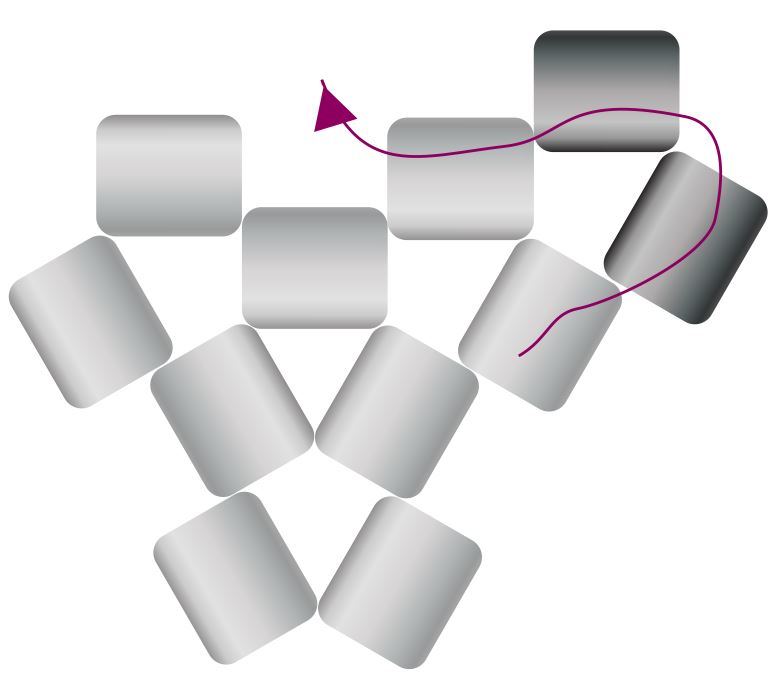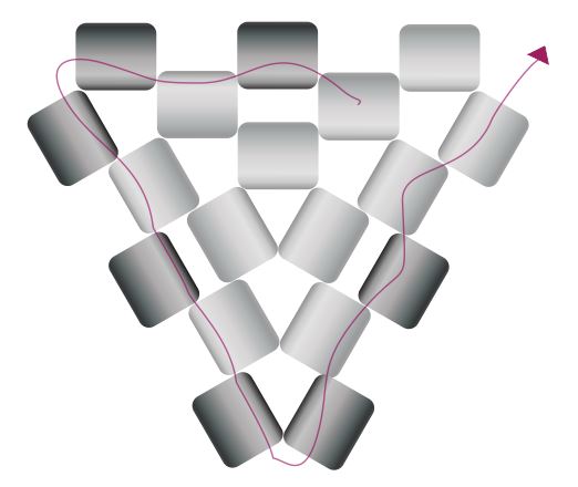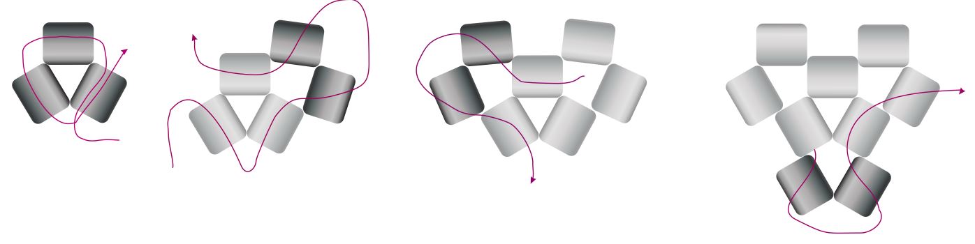 Pásky pro připojení hematitového čtverce se dělají stejným způsobem, jako pásky pro spojování trojúhelníků viz. výše. Je pouze potřeba udělat je tak dlouhé, aby se po provlečení čtvercem daly přišít na spodní straně k trojúhelníku.