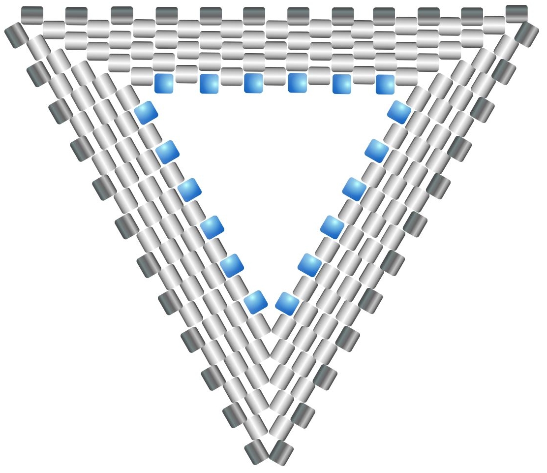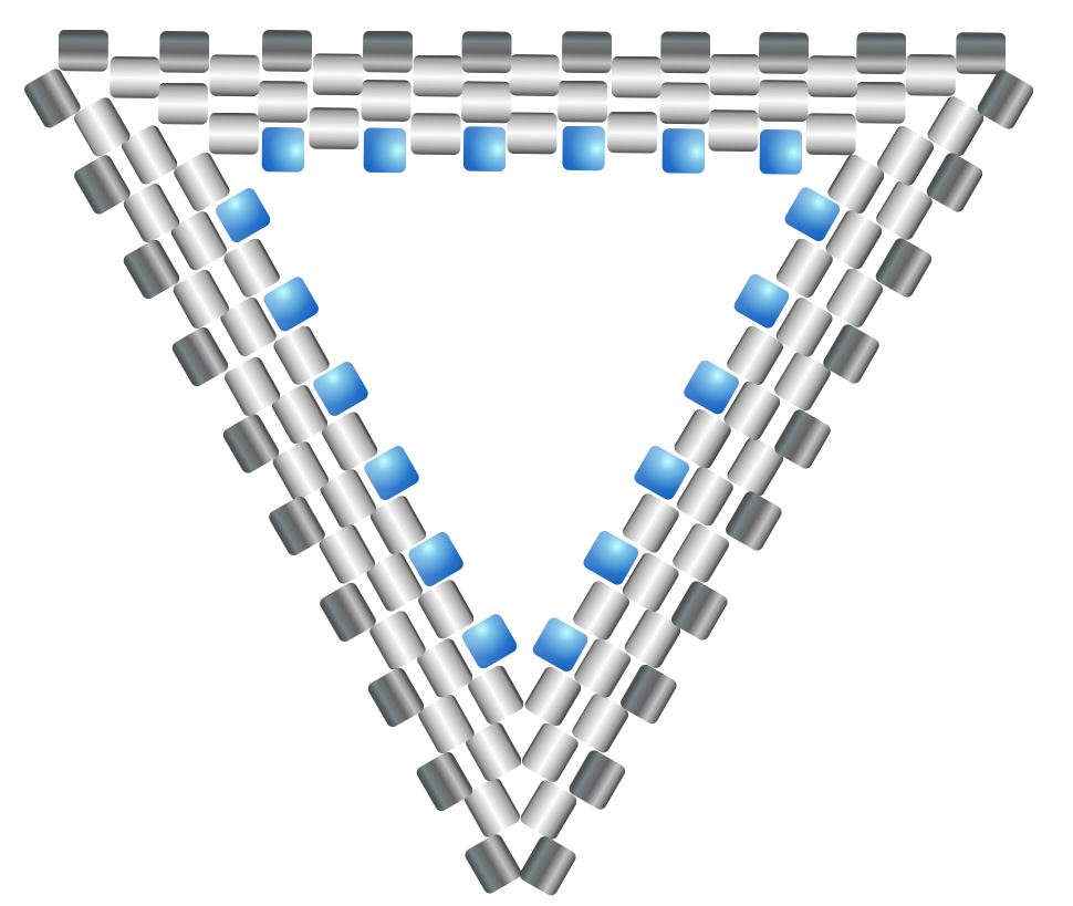 Krok 5 a 6 opakujte stále dokola do požadované velikosti trojúhelníku. Uvidíte, jak se pěkně začal tvořit trojúhelník, postup v rozích je stále stejný (korálky vždy srovnejte tak, aby na sebe pěkně dosedly ve tvaru, jaký je na obrázku). Na stranách trojúhelníku se všívá po jednom korálku a v každé následující řadě je jich o jeden více.