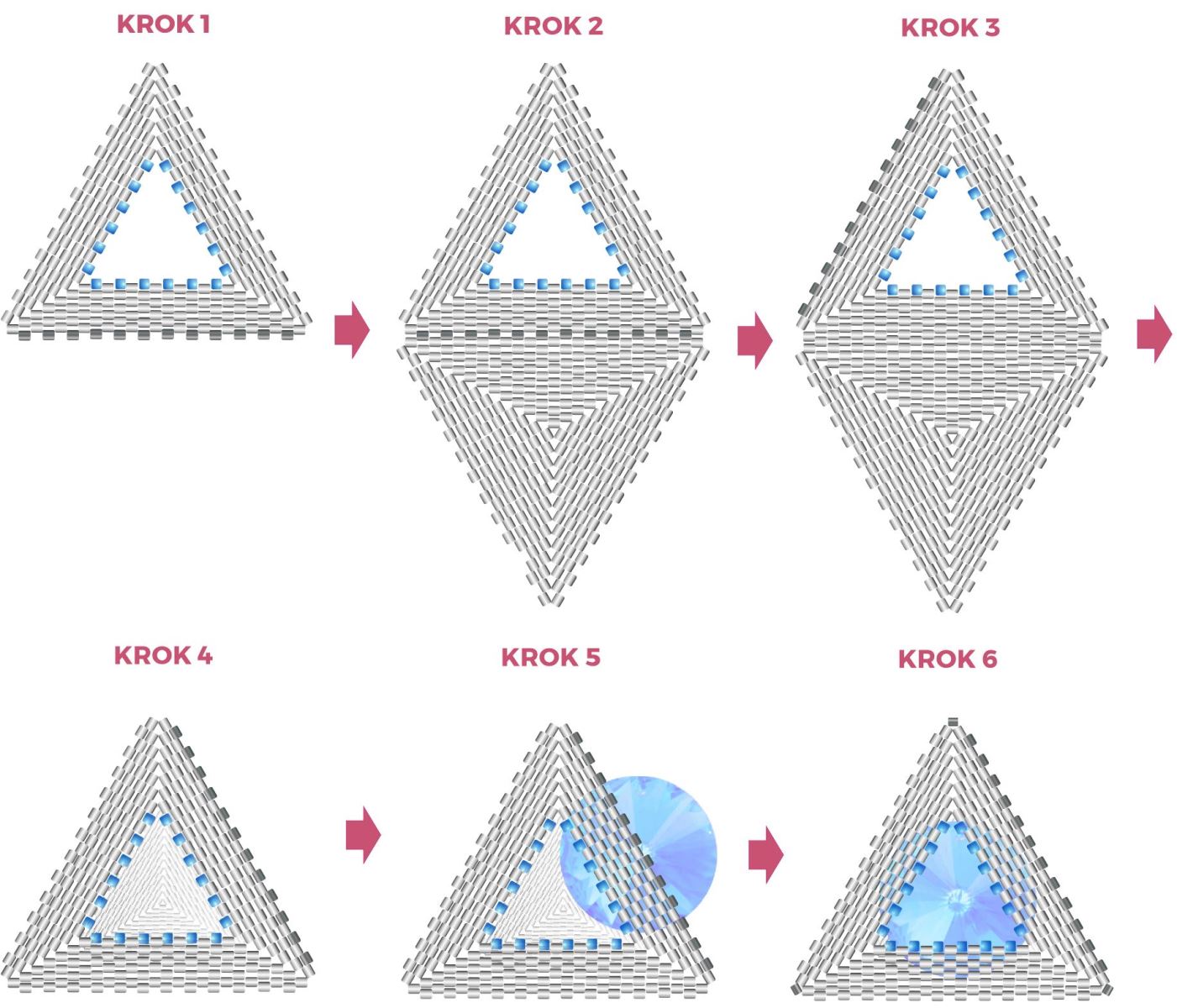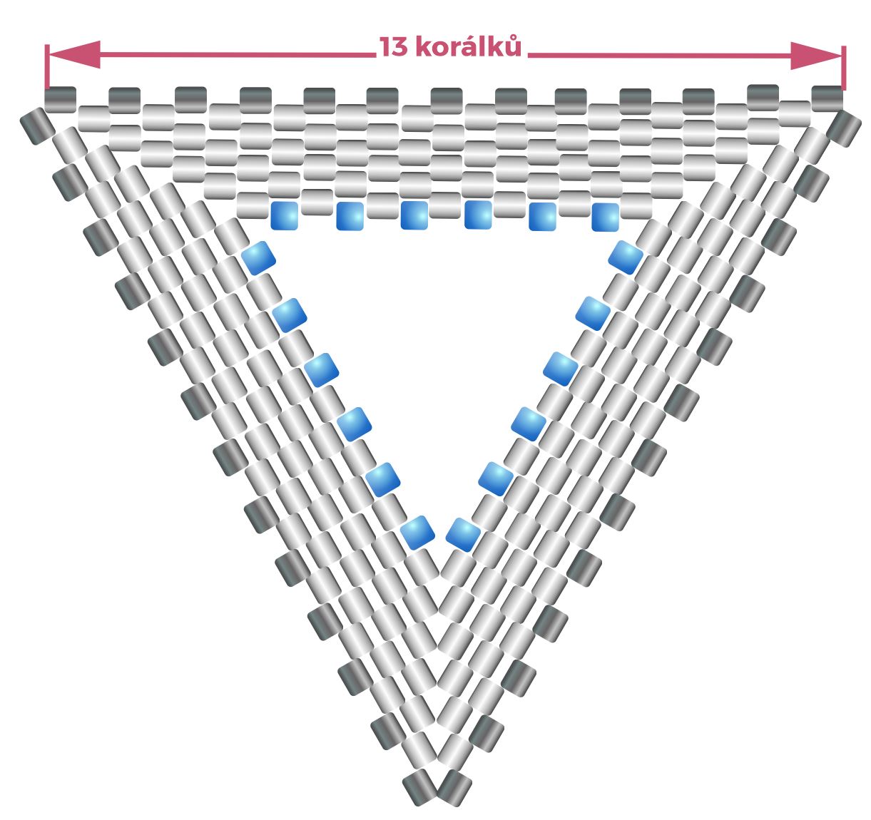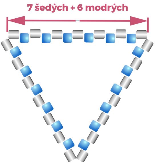 KROK 2 až 7 - u každé další řady přidáváte korálky stejně, jako tomu bylo u spodní části trojúhelníku, až se dostanete opět na počet 13 korálků v řadě (KROK 7)