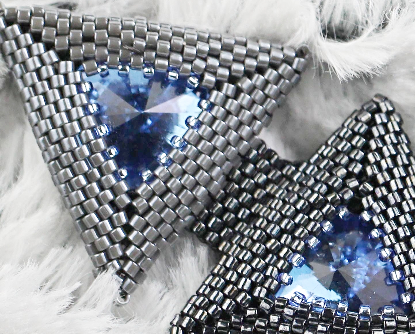 KROK 4 - opět navlékněte 2xTR12 a prošijte následující TR12 z první řady a tím je vytvořený základ trojúhelníku. Nit prošijte ven prvním korálkem přidávaným ve druhé řadě.