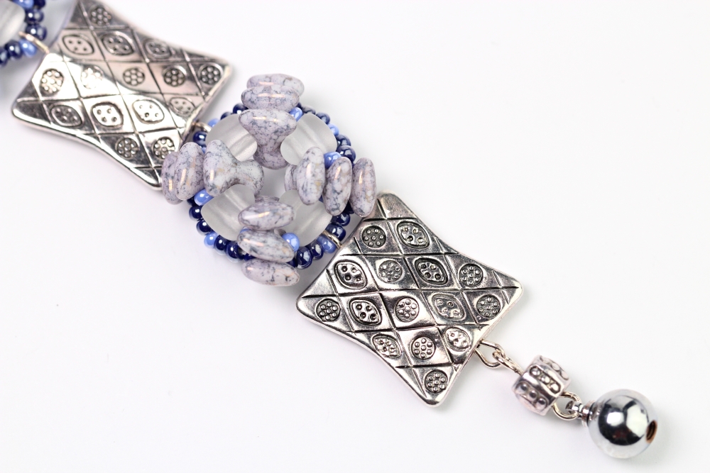 Pomocí ketlovacích jehel připojte zapínání, zde je zvolena šroubovací kulička, ale lze použít i karabinku nebo americké zapínání. Pokud budete potřebovat náramek delší, můžete vložit ještě malé kovové korálky, jako je to na obrázku, aby délka náramku vyhovovala.