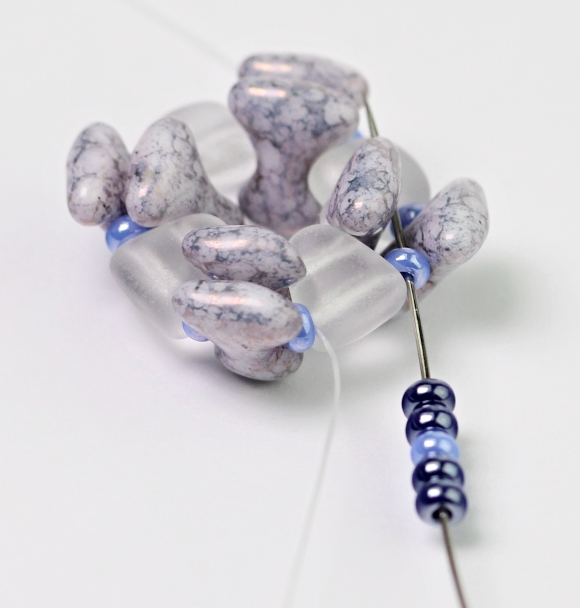 Navlékněte 1xR10 + 1xTEE + 1xR10 a prošijte druhou dírku korálku NIB.