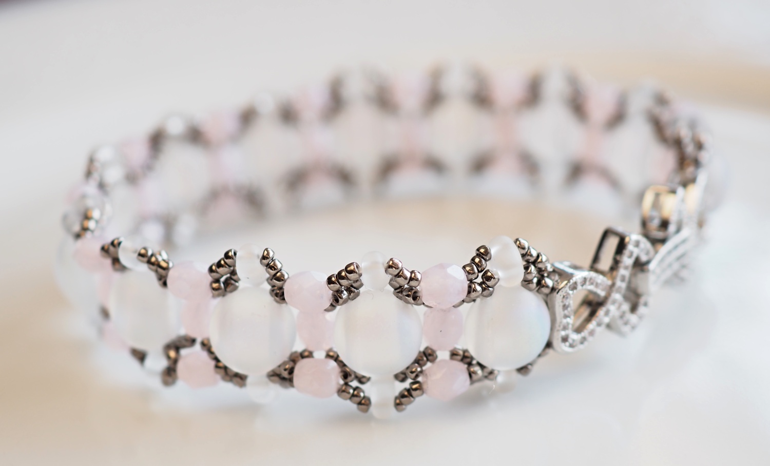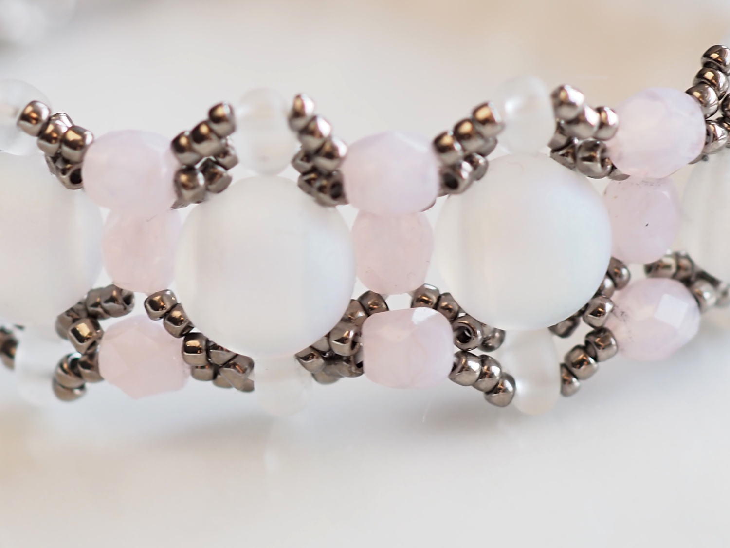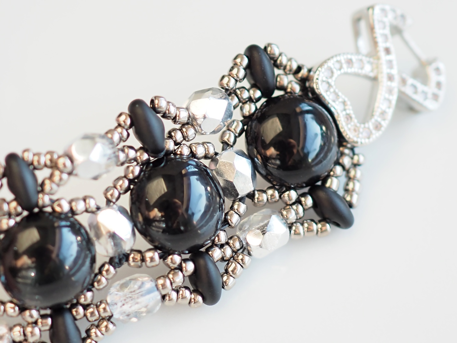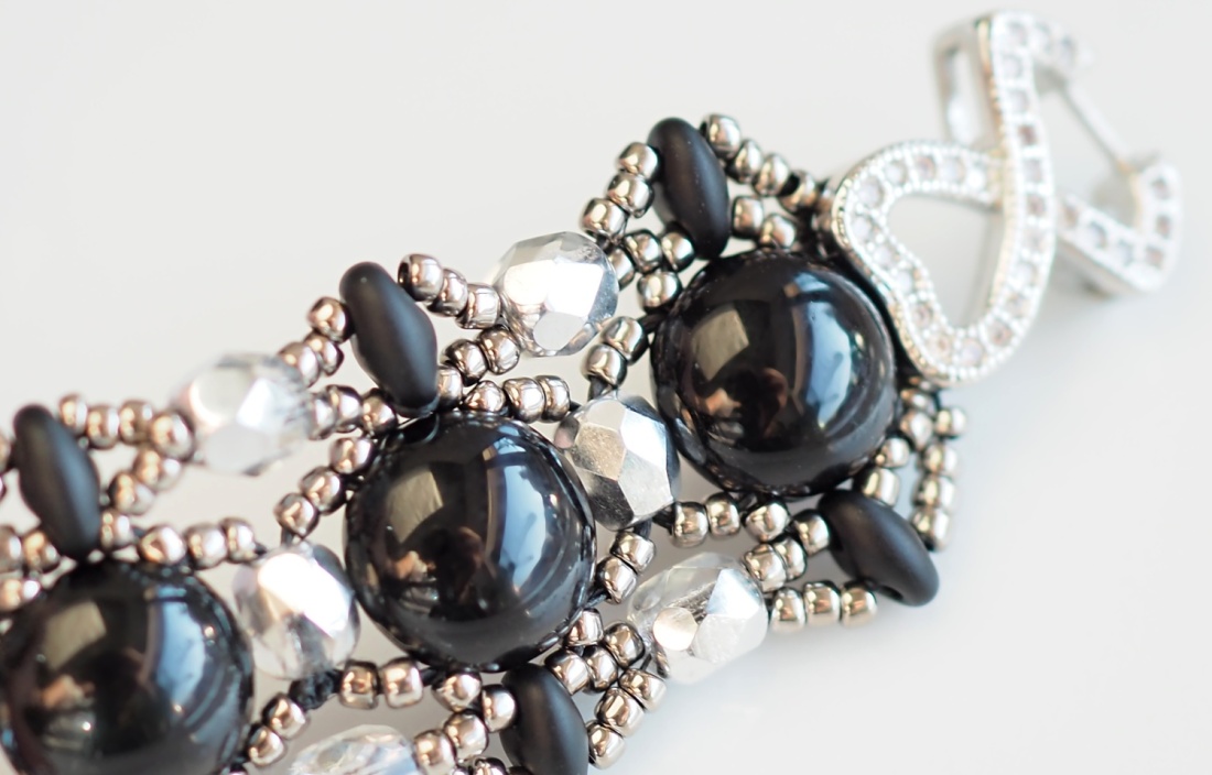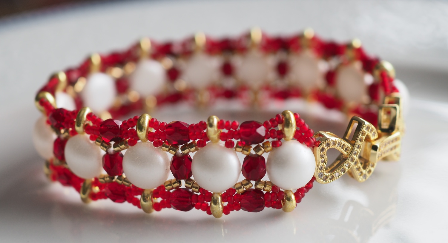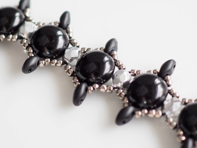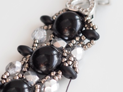 jedná se o osvědčený bižuterní patent. Základ náramku tvoří perle Candy 8 mm, doplněné broušenkami 4 mm, korálky Twin a vše spojené rokajlem 15/0.