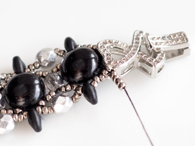 Poslední řada zakončí stranu náramku. Začněte navlečením 4xR15 a prošijte horní dírku Twinu. Naberte 3xR15 a prošijte BR. Naberte 3xR15 a prošijte následující Twin v horní dírce. Stejně pokračujte až k zapínání, kde jsou opět 4xR15.