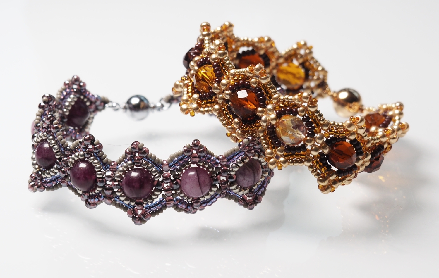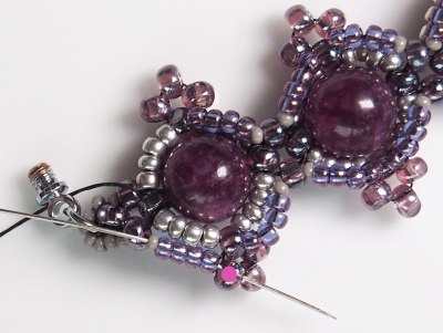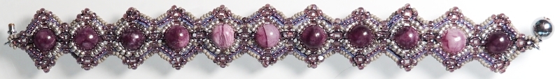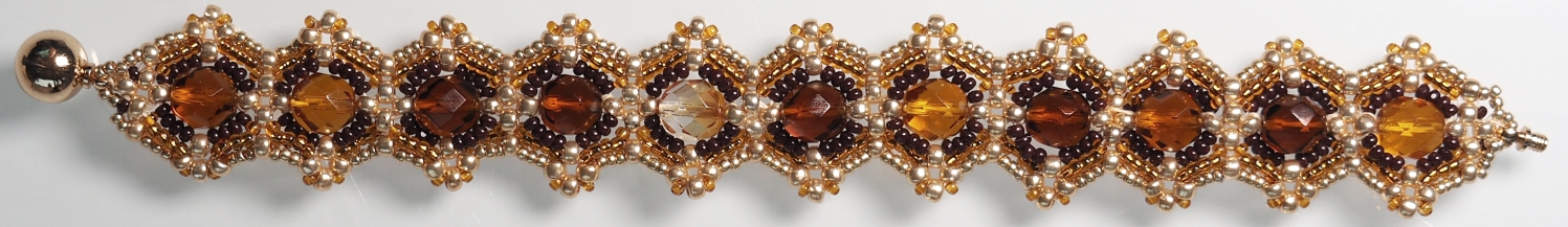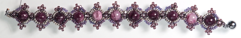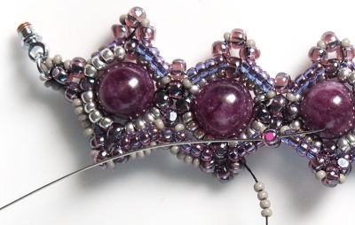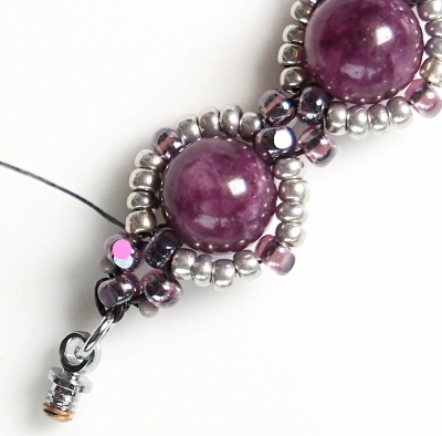 Musíte pořádně utahovat a v poslední řadě vše do sebe zapadne. Zhodnoťte, jestli ve Vašem výrobku nebudou lepší 3 R15 než 4 R15, protože to závisí na přesnosti korálků v předešlých řadách (mohou být nepatrně menší a pokud byste dali 4 R15 tak, že budou příliš natěsno mezi Charlotkami, mohl by se Vám náramek vlnit) Cílem je poslední řadou vše stáhnout, ne rozvlnit :)