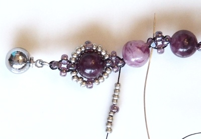 Mezi označené CH všijte 5xR15. Projeďte přes následující 4 korálky (R15 + CH + R15 + CH15).
