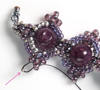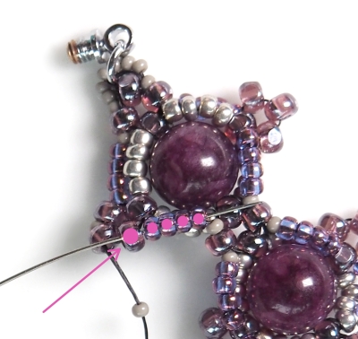 Nit postavte do označené CH. Naberte R15 a všijte do vedlejší CH, toto opakujte ještě jednou a prošijte všechny označené korálky (1xCH + 4x R11).