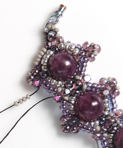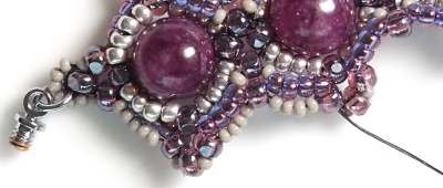 Krok 5 opakujte na druhé straně kuličky (4x R10 + 1x CH + 4x R10) a prošijte všechny korálky přidané v kroku 5 + 3 CH, tak, abyste se dostali nití do CH těsně u další kuličky.