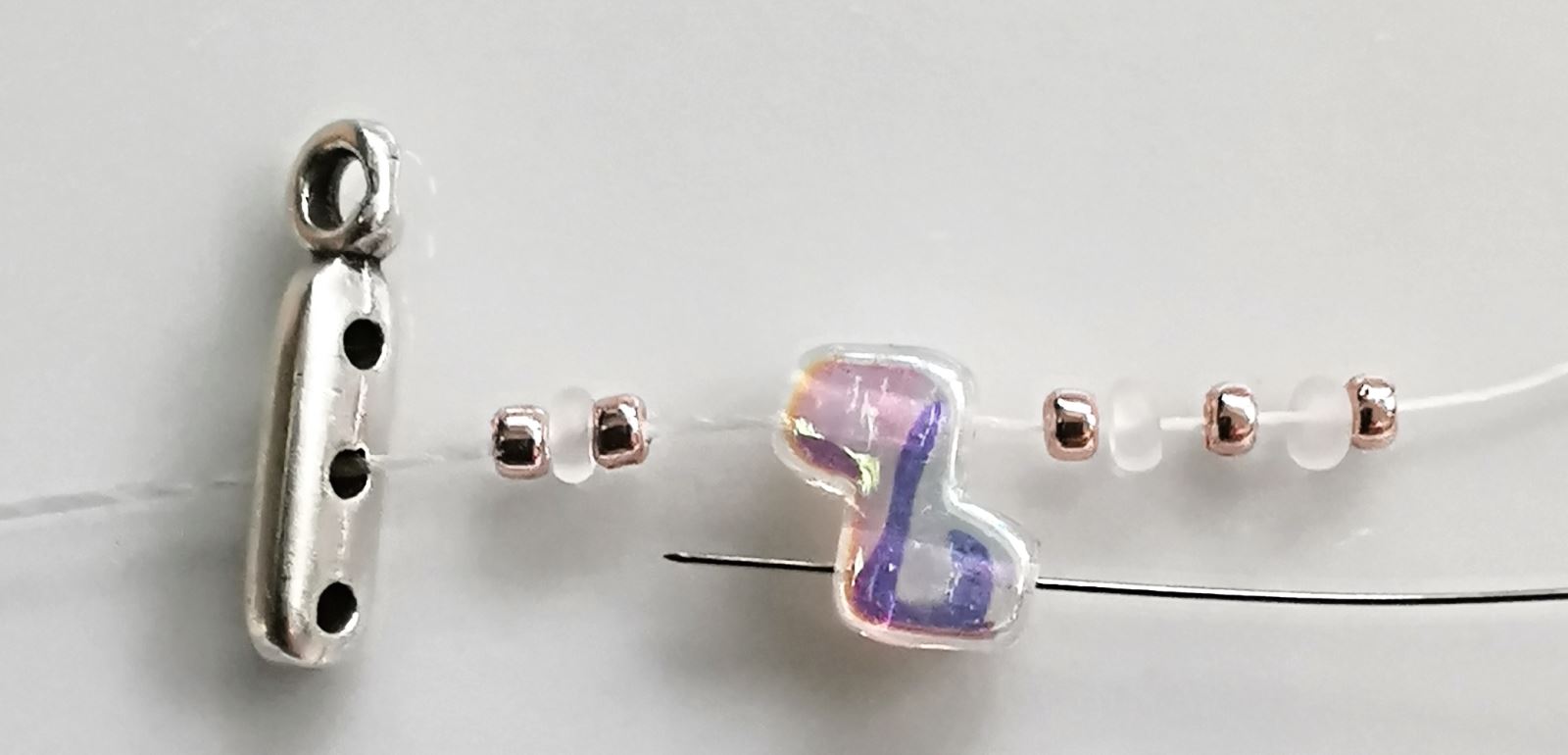 Prošijte volnou dírkou Z zpět a navlékněte: R15 + TOR + R15. Všechny doposud přidané korálky prošijte ještě jednou a svažte oba konce nitě. Korálky zatáhněte k sobě přiměřeně, tak aby neměly mezi sebou mezery, ale nestahujte je přespříliš, protože pak by se Vám konec náramku kroutil.