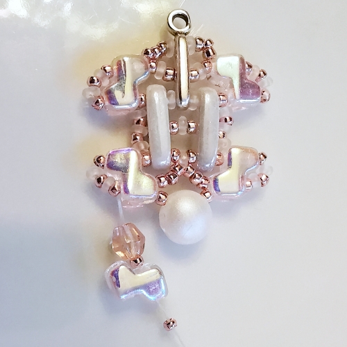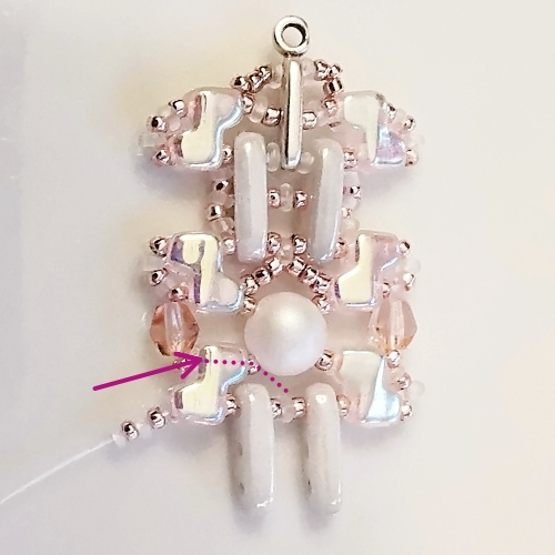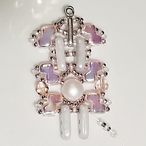Prošijte Z zpět volnou dírkou a naberte R15. Prošijte BM v horní dírce, korálky zatáhněte. Korálky přidané od kroky 10 prošijte všechny znovu pro zpevnění. Předejdete tak přetržení náramku.