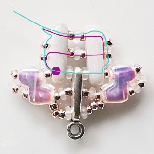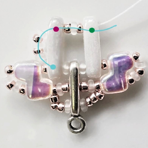 Fialová značka značí odkud vychází nit z předchozího kroku. Prošijte TOR + R15 + TOR z kroku 7 (podle fialové linky) a naberte R15 + TOR + R15, prošijte nit podle tyrkysové linky.