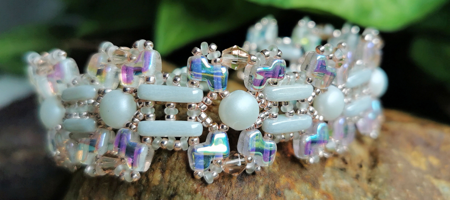 Jemný a lehoučký náramek, jehož základ tvoří korálky ZET BEADS, CANDY PRECIOSA a BEAM, které jsou doplněné TOHO a kuličkami o vel 4 mm.