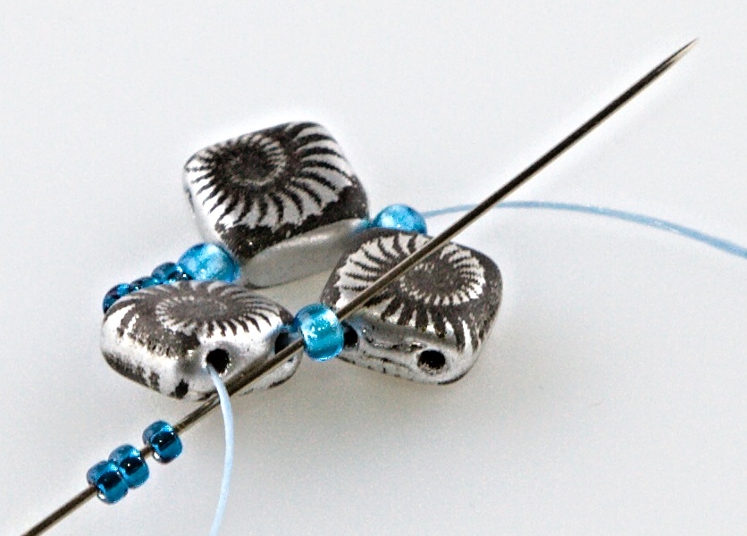 Přidané korálky stáhněte k T a prošijte nit přes následující 3xR15+R11+3xR15. Opakujte KROK 4 ještě 2x.