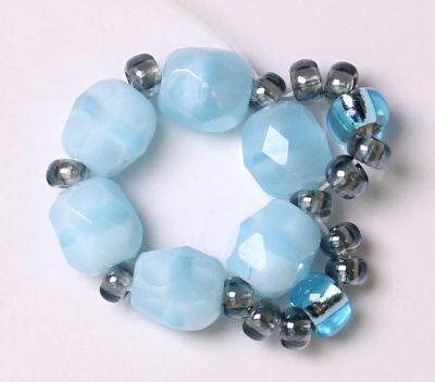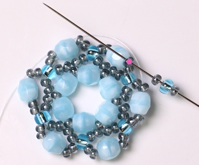 Navlékněte střídavě 6x BP a R11/0. Prošijte je znovu od prvního navlečeného korálku a kroužek pěkně svažte. Nit vychází z R11/0.