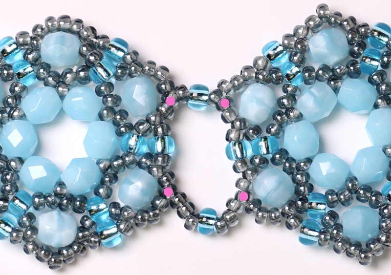 Ušité jednotky spojte dle obrázku přes označené korálky (vše prošijte nejméně 2x). V horní části přes 1xR11 + 1xR8 + 1xR11 a v dolní části 3xR11 + 1xR8 + 3xR11.