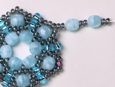 Nit vychází z R8. Naberte 2xR11 + 1xBP + 2xR11. Prošijte následující R8 z předchozí řady. Toto opakujte dokola. Nit postavte do prvního R11 za BP.