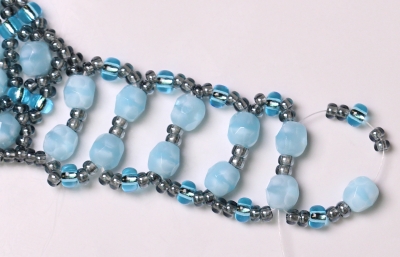 Náramek udělejte z pěti jednotek spojených přes 1xR11 + 1xR8 + 1xR11. Zapínání přišijte stejným způsobem jako na náhrdelníku.