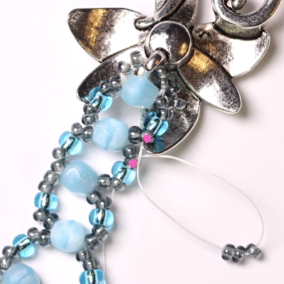 Naberte 2xR11 + 1xR8 + 2xR11 + 1xBP + 2x11 + 1xR8 + 2xR11. Tento krok opakujte, jak bude podle požadované délky náhrdelníku. Pak přes 2x 2 rokajly 11/0 přišijte Americké zapínání. Prošijte opakovaně pro zpevnění tolikrát, kolikrát Vám to korálky dovolí.
