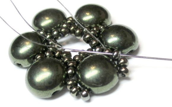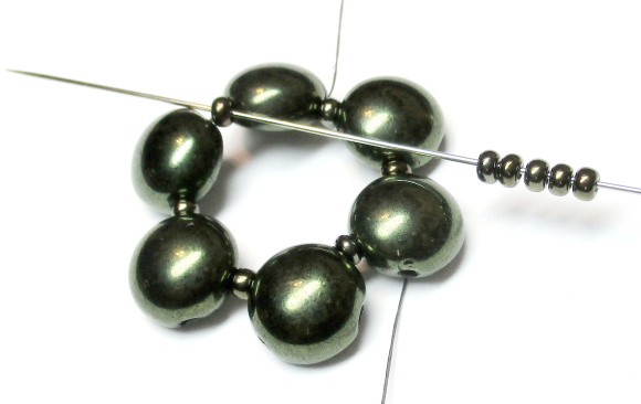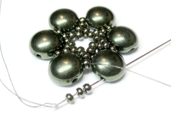 Jehlu provlékněte korálky tak, aby vycházela z posledního ze čtveřice rokajlů. Navlékněte 2xR11 + 1xR6 + 1xR11 + 1xR6 + 2xR11 a jehlu provlékněte výchozí čtveřicí korálků R11. Pro větší pevnost prošijte právě přišité korálky ještě alespoň jednou, poté návlek do věnečku řádně zapošijte.
