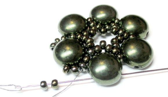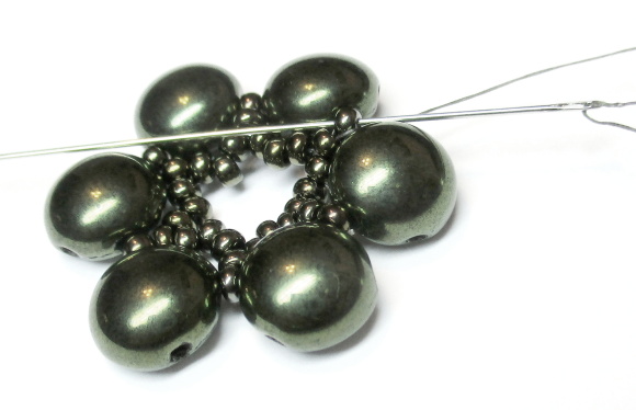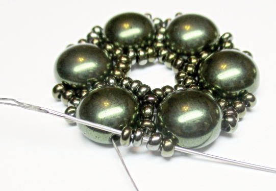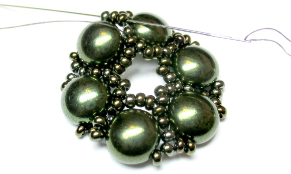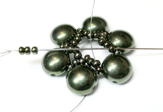 Krok 5 a 6 opakujte po celém obvodu věnečku, Jen nad posledním korálkem C ušijete oblouček ze 3 korálků R11 a jehlu vpíchněte do prvního korálku prvního ušitého obloučku.