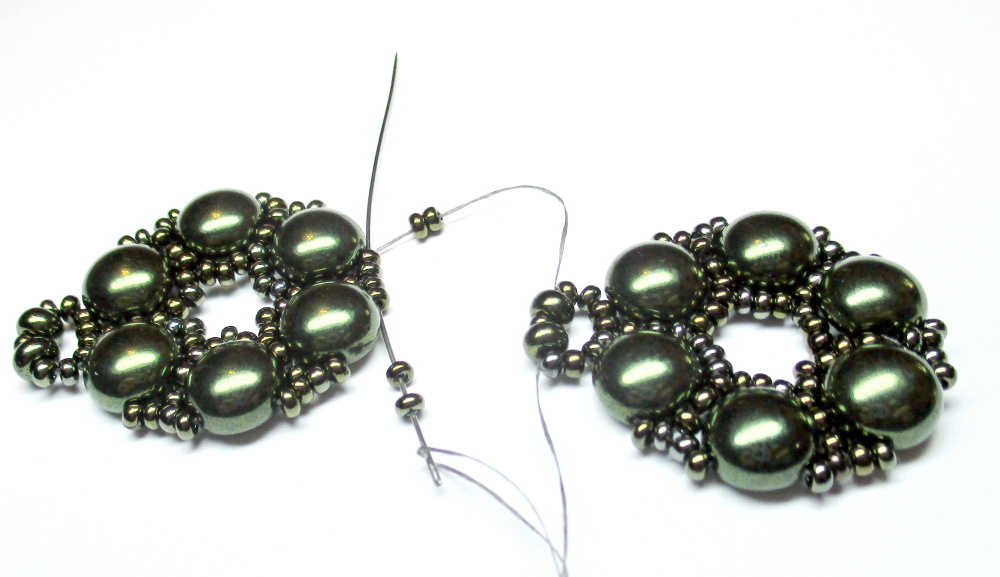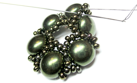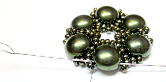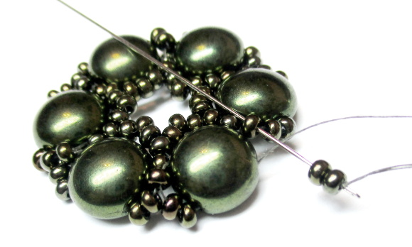 Navlékněte 2xR11 a jehlu provlékněte výchozí čtveřicí korálků R11. Právě ušité prošijte pro větší pevnost alespoň ještě jednou, poté návlek do věnečku řádně zapošijte.