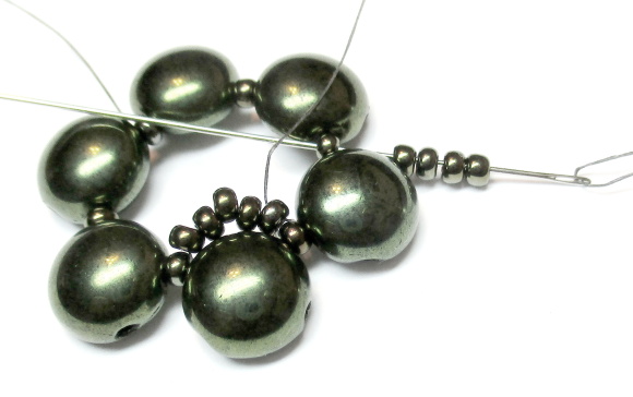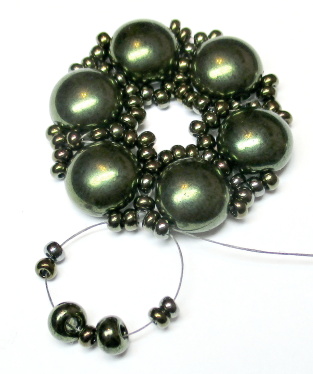 Máte ušitý první dílek- věneček. Podle výše popsaného postupu ušijte další věneček, po došití ale návlek neukončujte, jehlu prošijte korálky tak, jak je znázorněno na fotografii,