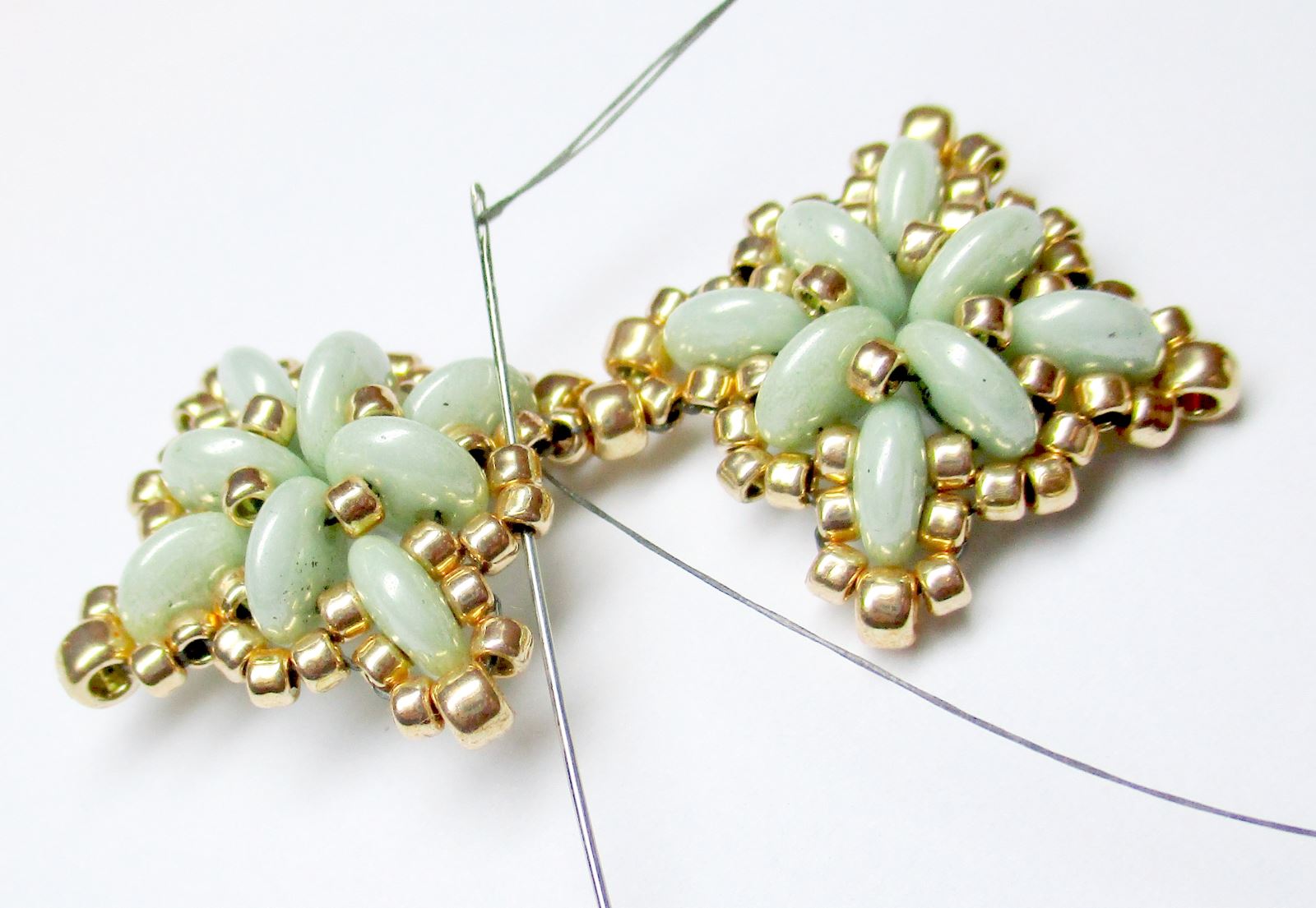 Krok 5 zopakujte ještě 3x , korálky přitom stáčejte doprostřed motivku a návlek utahujte. Poté právě ušité ještě jednou prošijte.
