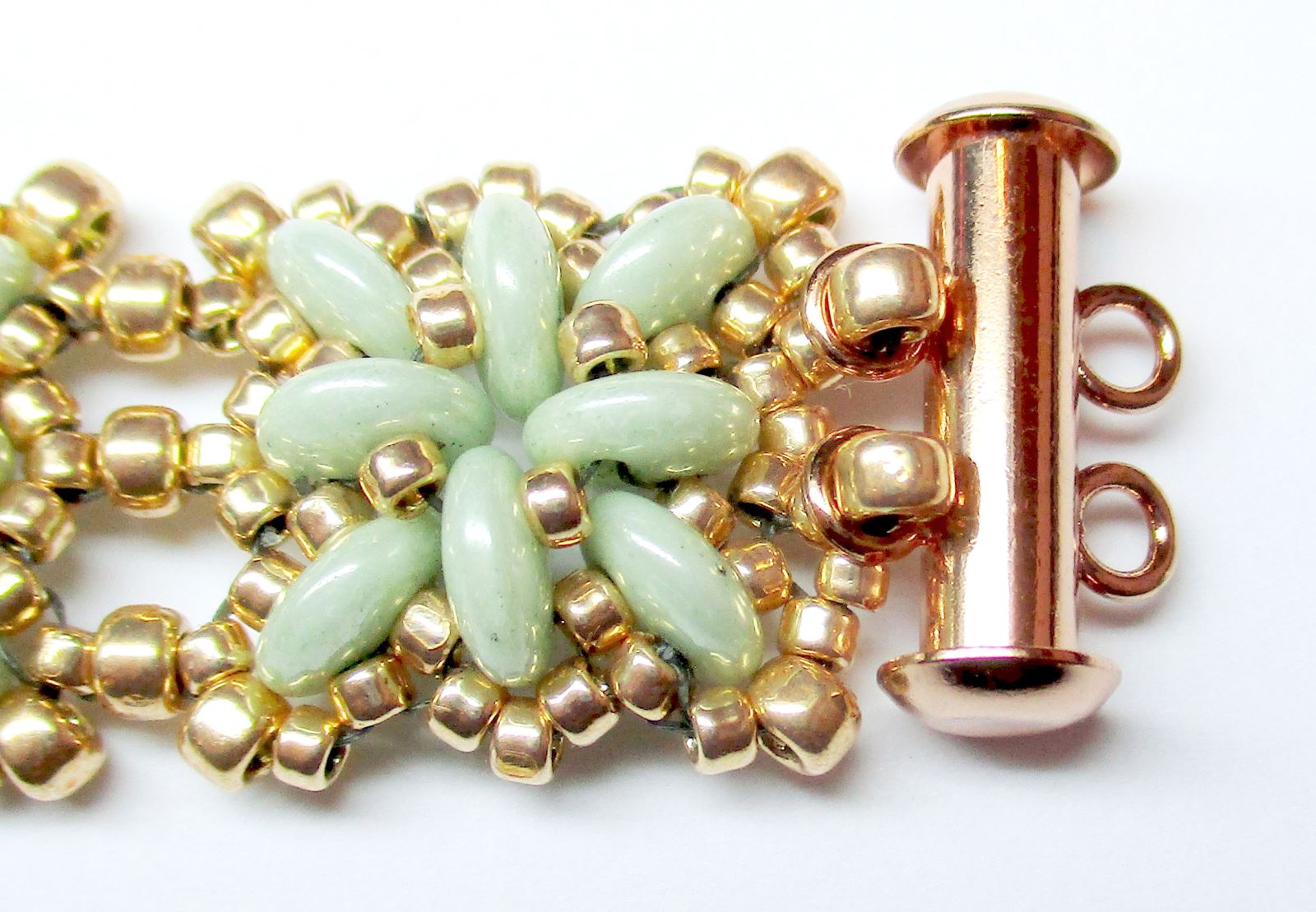 Podle výše uvedeného postupu ušijte a spojte potřebný počet motivků. U krajních dílků návlek neukončujte, jehlu prošijte korálky tak, aby vycházela z korálku na obrázku označeného červenou tečkou, navlékněte 1xR11, jehlu provlékněte očkem u zapínání, navlékne R8 a jehlu provlékněte zpátky očkem u zapínání, navlékněte 1xR11 a jehlu provlékněte korálky tak, jak je znázorněno na fotografii.