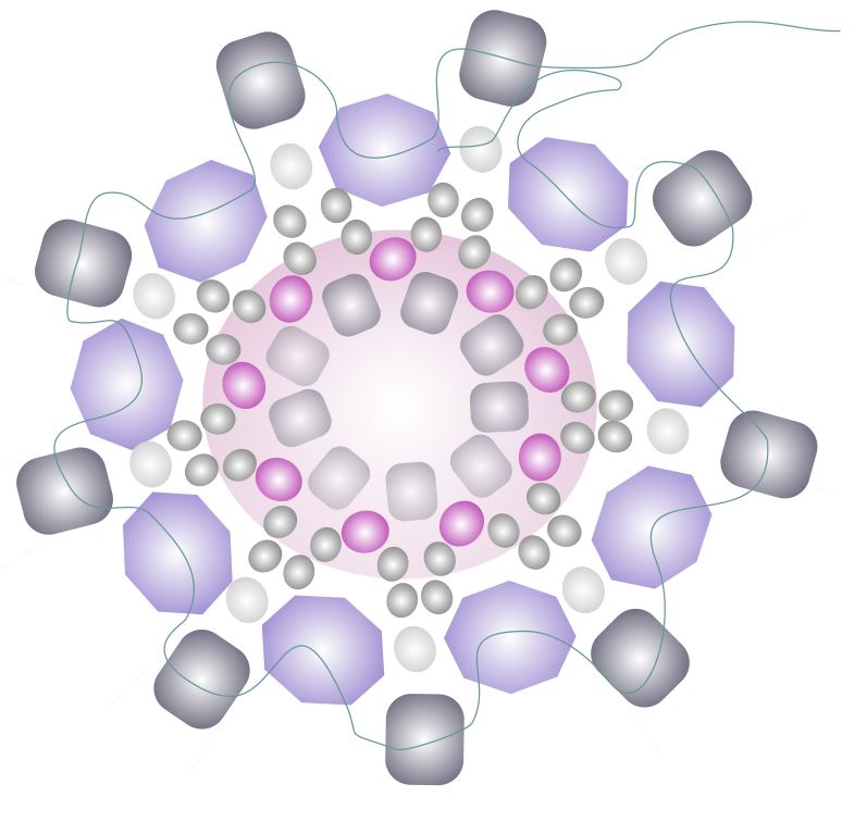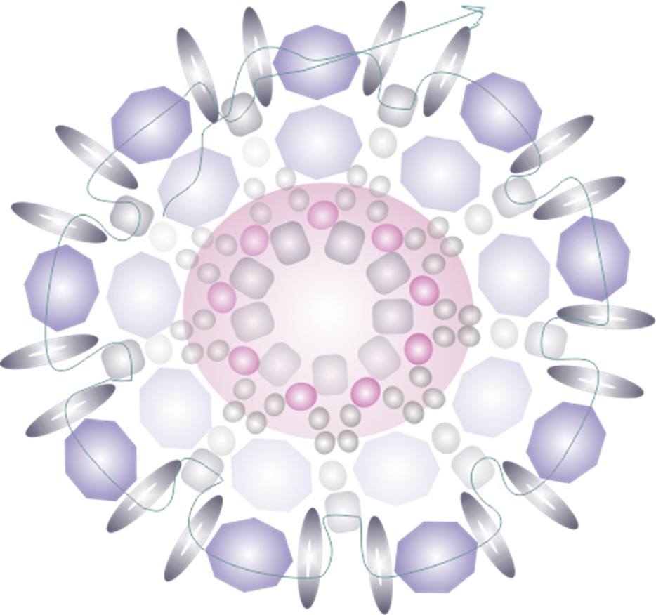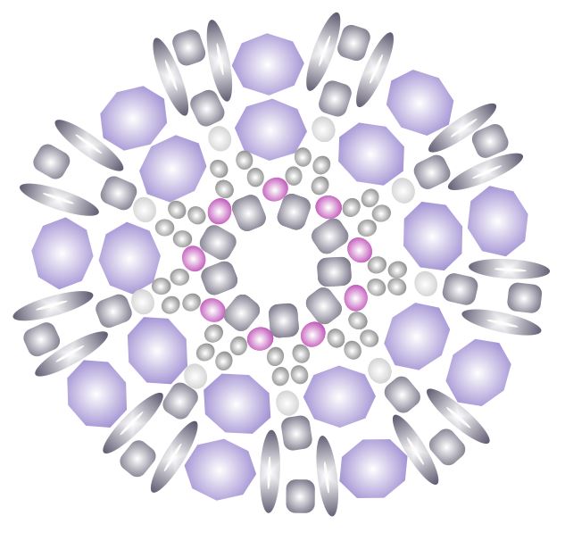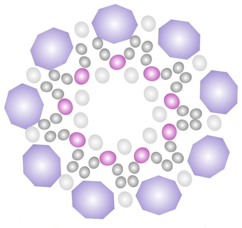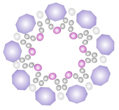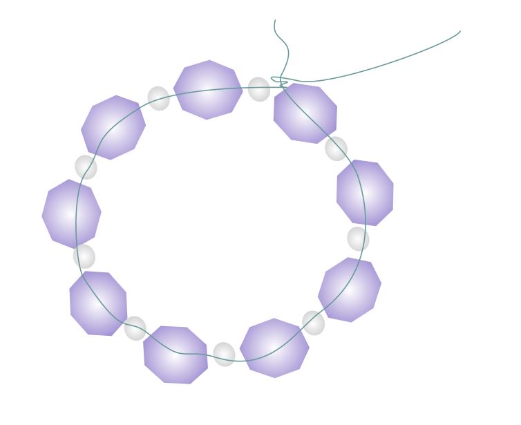 Prošijte R10 v základním kroužku, pak navlékněte 2xR15+1xR9+2xR15, poté prošijte další R10 v základním kroužku. Toto opakujte dokola kroužku.