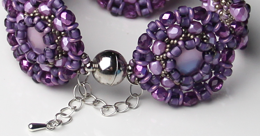 Po spojení všech pěti dílů náramku přišijte zapínání dle Vaší volby. Zde je použito magnetické zapínání. Přišito je přes rokajl R11 a R10 na každé straně magnetického zapínání. Poté je připevněn pojistný řetízek. Na řetízek je možné připevnit drobné stříbrné přívěsky.
