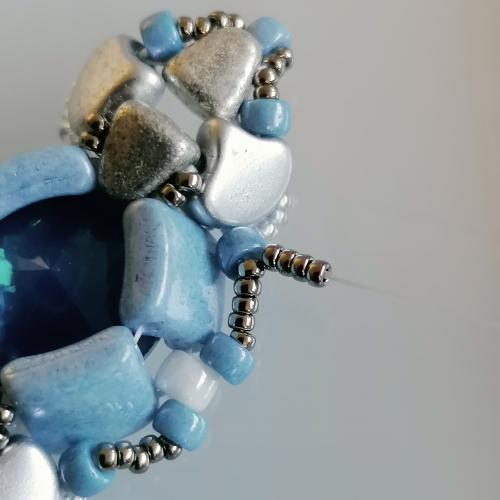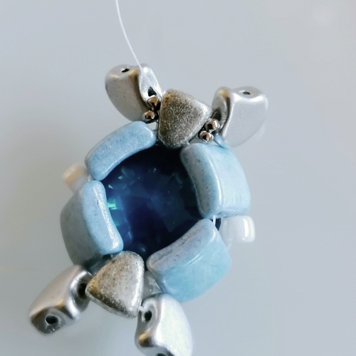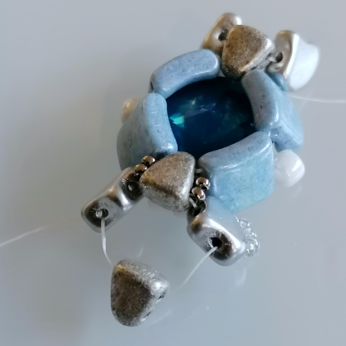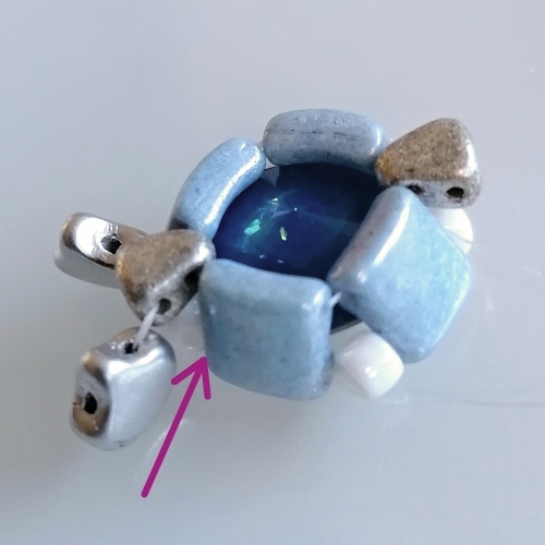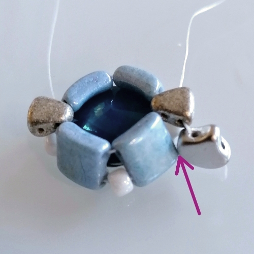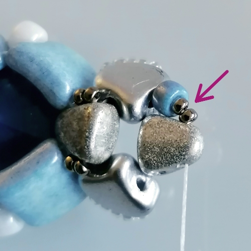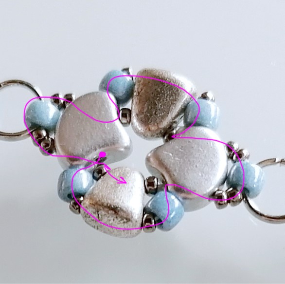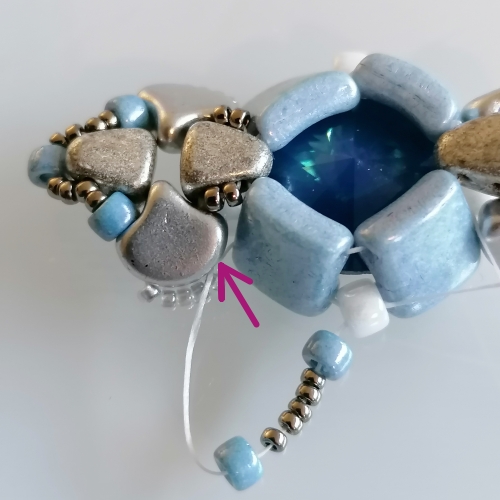 Navlékněte 2xF + NB + 2xF + NB a prošijte všechny korálky ještě jednou od prvního navlečeného korálku. Stáhněte k sobě a Udělejte dvojitý uzlík. |