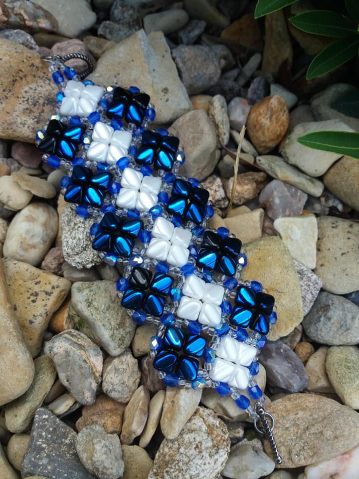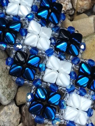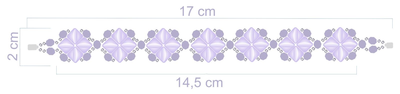 Středovou část náramku tvoří 7 jednotek, opakujte tedy kroky 5 až 8. Výsledná délka náramku se sedmi jednotkami je 17 cm. Pokud máte silnější zápěstí, udělejte v základní řadě 8 jednotek. Délka náramku pak bude 19 cm. Tyto rozměry jsou včetně zvoleného magnetického zapínání K1584. Pokud zvolíte jiné, můžete tím konečnou velikost ovlivnit. Lze také zvolit klasickou karabinku a velikost náramku regulovat prodlužovacím řetízkem.