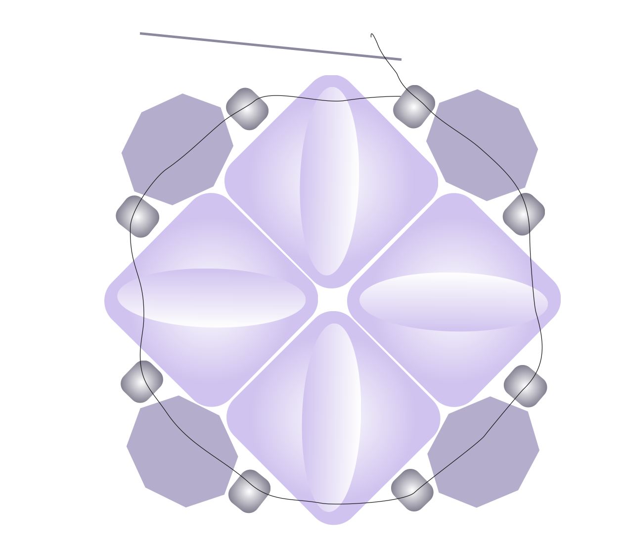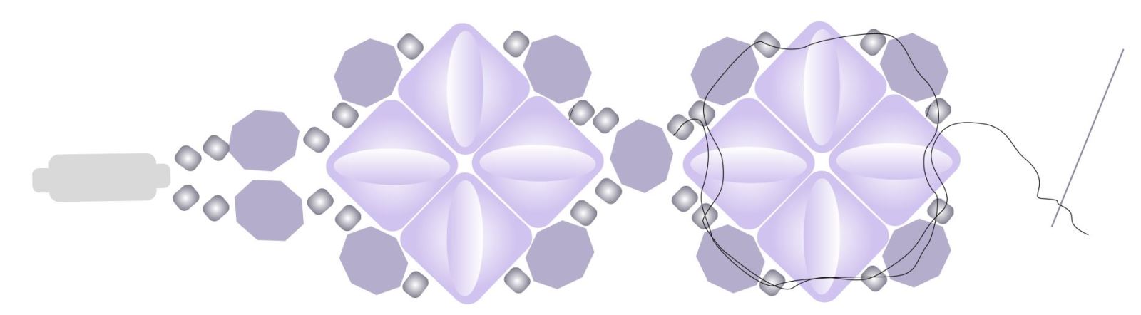 Navlékněte R9+BR+R9 a všijte do vedlejší SBD19. Toto opakujte 4x po obvodu čtverce. Vše prošijte 2x.