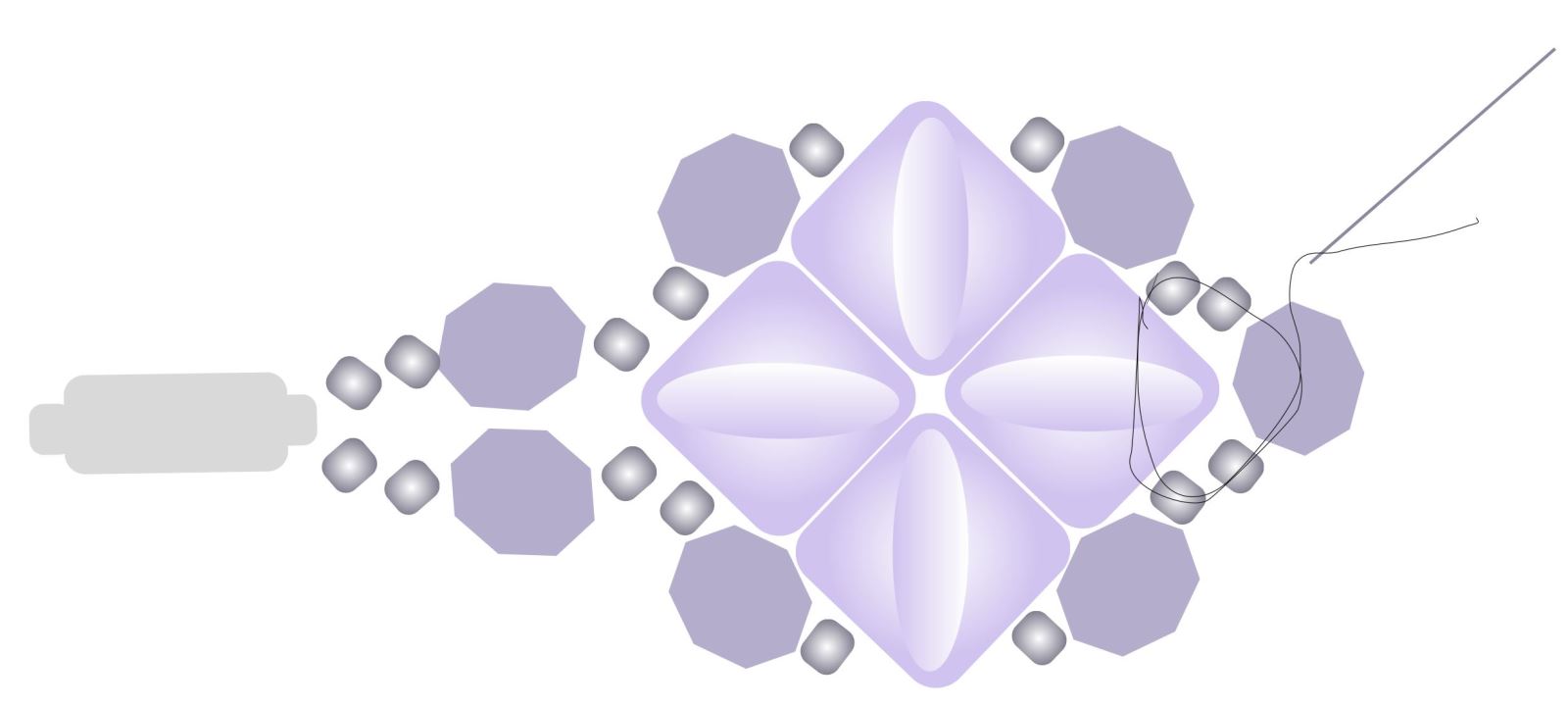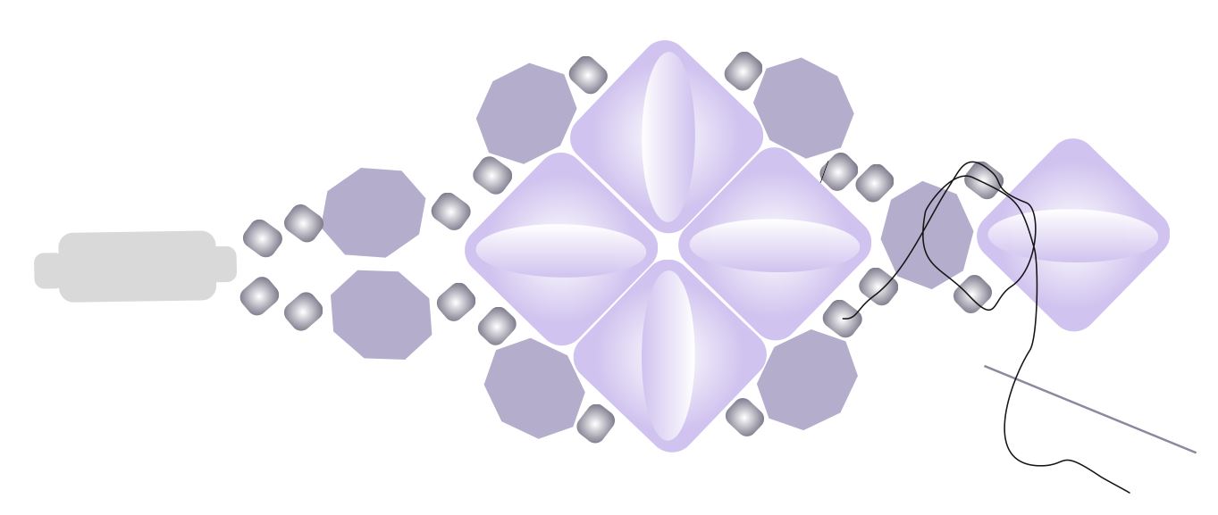 Jehlu postavte do polohy na obrázku. Nit se po prošití protáhne do mezery mezi korálky a obročí kolem rohu korálku. V této fázi je tedy viditelná na vnějším okraji výrobku, ale nemějte obavy, po našití dalších korálků se nit skryje.